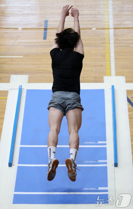 (대구=뉴스1) 공정식 기자 = 21일 오전 대구 달서구 계명대학교 성서캠퍼스 체육관에서 열린 '2026학년도 대입 정시모집 체육학과 실기고사'에서 한 수험생이 제자리멀리뛰기를 하고 있다. 2026.1.21/뉴스1
