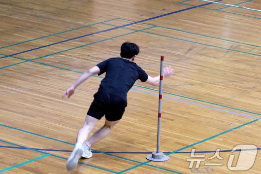 (대구=뉴스1) 공정식 기자 = 21일 오전 대구 달서구 계명대학교 성서캠퍼스 체육관에서 열린 '2026학년도 대입 정시모집 체육학과 실기고사'에서 한 수험생이 Z자 달리기를 하고 있다. 2026.1.21/뉴스1
