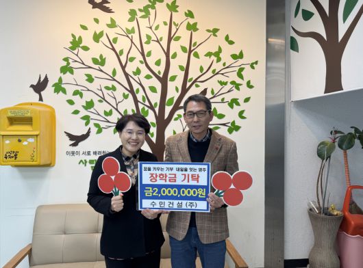 수민건설 주식회사(대표 김효식)는 지난 20일 가흥1동 행정복지센터를 방문해 예비 대학생을 위한 장학금 200만 원을 기탁했다.