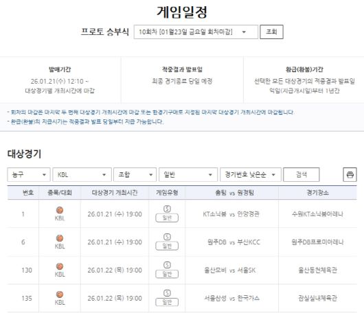 한편 주중 KBL 경기를 대상으로 하는 프로토 승부식 10회차의 게임 정보 및 자세한 경기 분석 내용 등은 '베트맨'과 토토가이드 페이지 등을 통해 확인할 수 있다.