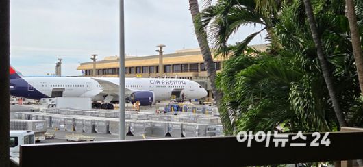 미국 하와이 호놀룰루 공항에서 대기 중인 에어프레미아 여객기. [사진=박지은 기자] |