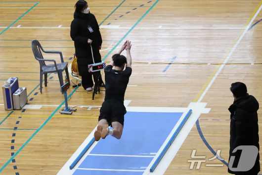 (대구=뉴스1) 공정식 기자 = 21일 오전 대구 달서구 계명대학교 성서캠퍼스 체육관에서 열린 '2026학년도 대입 정시모집 체육학과 실기고사'에서 한 수험생이 제자리멀리뛰기를 하고 있다. 2026.1.21/뉴스1