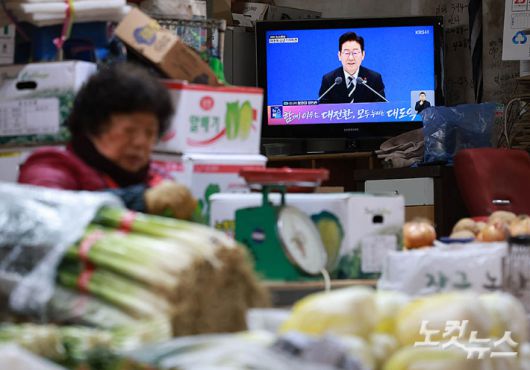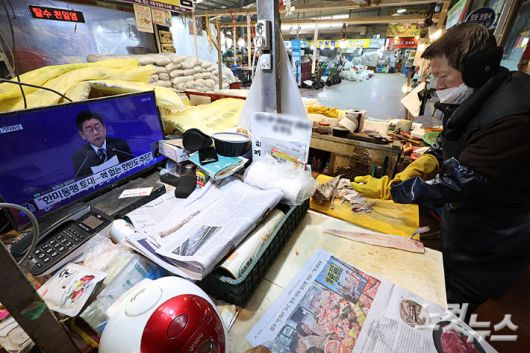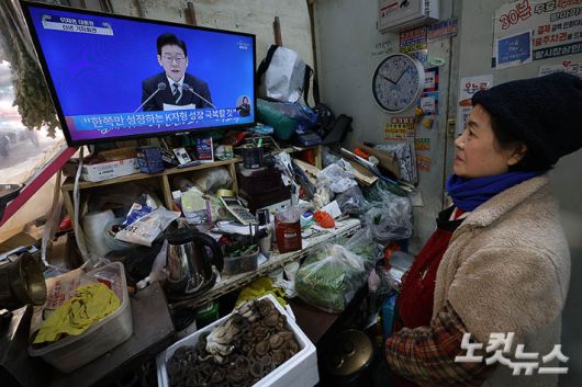 '李 대통령의 새해 국정 구상은?'…기자회견 보는 상인들[노컷네컷]