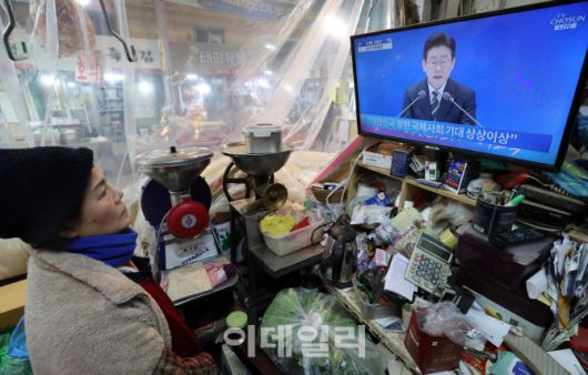 [이데일리 방인권 기자] 21일 서울 서대문구 인왕시장 내의 상인들이 이재명 대통령의 신년 기자회견 방송을 시청하고 있다.