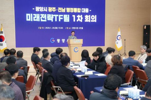 전남 광양시는 지난 20일 시청 시민홀에서 '광양시 광주·전남 행정통합 대응 미래전략 TF팀' 1차 회의를 열고, TF팀원 및 관계자 100여 명이 참석한 가운데 행정통합 대응 방향에 대한 논의를 시작했다고 밝혔다.