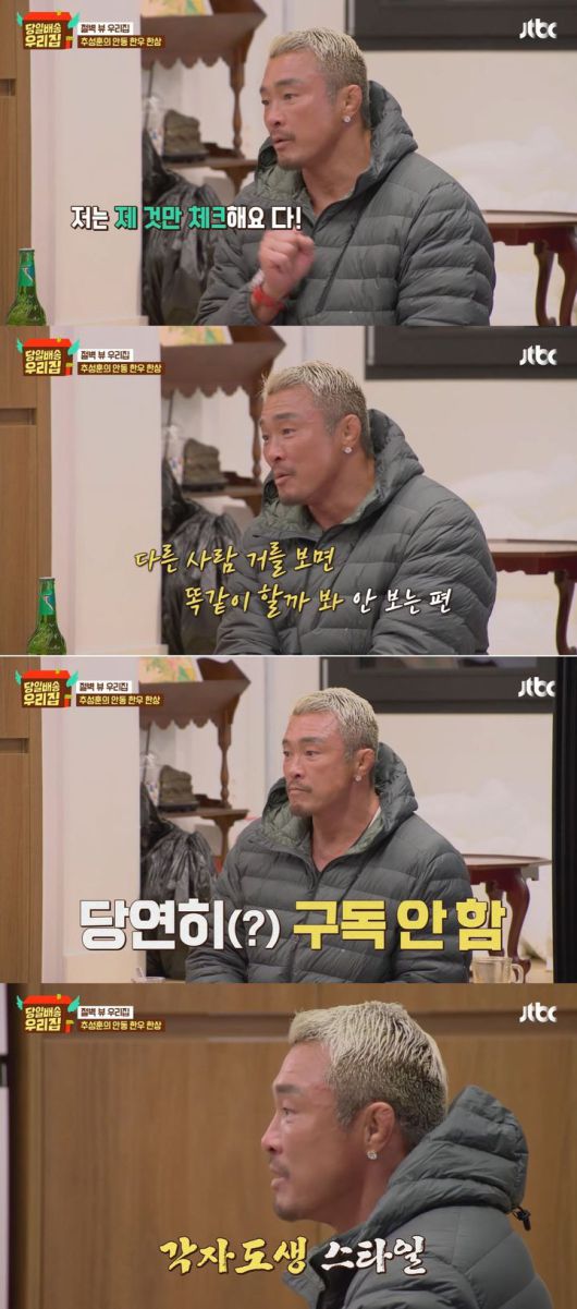 [서울=뉴시스] 방송인 추성훈이 지난 20일 방송한 JTBC 예능 프로그램 '당일배송 우리집'에 게스트로 출연했다. (사진=JTBC '당일배송 우리집' 캡처) 2026.01.21. photo@newsis.com *재판매 및 DB 금지 |