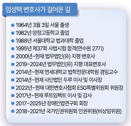 대한변호사협회(변협) 제14회 변호사공익대상을 수상한 임성택(사법연수원 27기) 법무법인 지평 변호사는 한국의 법조계에 프로보노 문화를 뿌리 내리고 변호사 공익활동의 저변을 넓힌 선구자로 꼽힌다. 지평의 창립 멤버이자 최근까지도 대표변호사를 맡았던 임 변호사는 부동산·공공정책·북한 분야 등 다양한 영역에서 전문성을 인정받는 법조인이다. 이른바 대형로펌에서 변호사 본연의 업무로 두각을 나타내는 동시에 장애인·사회복지·사회적기업 등의 분야에서 활발하게 활동하며 사회적 약자를 위한 공익법 활동 조성에도 기여해 왔다.