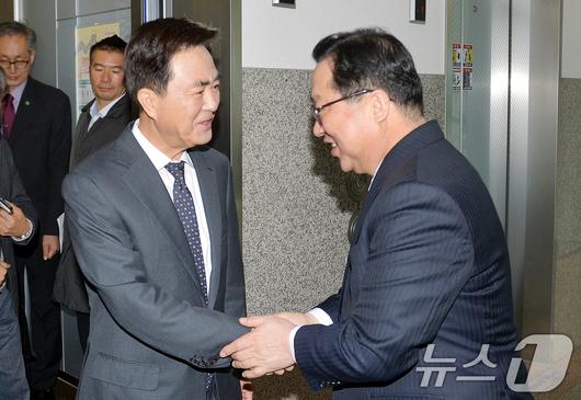 (대전=뉴스1) = 이장우 대전시장과 김태흠 충남도지사가 21일 대전시청에서 대전·충남 행정통합 관련 긴급 회동에 앞서 인사하고 있다.(공동취재) 2026.1.21/뉴스1presskt@news1.krCopyright ⓒ 뉴스1. All rights reserved. 무단 전재 및 재배포, AI학습 이용 금지.