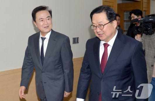 (대전=뉴스1) = 이장우 대전시장과 김태흠 충남도지사가 21일 대전시청에서 대전·충남 행정통합 관련 긴급 회동을 하기 위해 이동하고 있다.(공동취재) 2026.1.21/뉴스1presskt@news1.krCopyright ⓒ 뉴스1. All rights reserved. 무단 전재 및 재배포, AI학습 이용 금지.