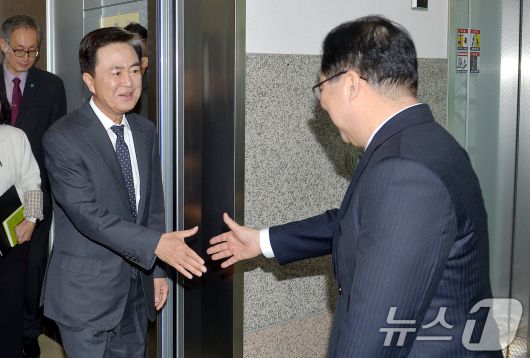 (대전=뉴스1) = 이장우 대전시장과 김태흠 충남도지사가 21일 대전시청에서 대전·충남 행정통합 관련 긴급 회동에 앞서 인사하고 있다.(공동취재) 2026.1.21/뉴스1