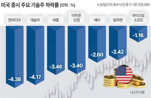 특히 이날 ‘매그니피센트 7(M7)’으로 불리는 시총 1조달러 이상 초대형 기술주들이 일제히 급락했다. 인공지능(AI) 대장주 엔비디아는 4.38% 하락하며 가장 큰 낙폭을 보였고, 이어 테슬라(-4.17%), 애플(-3.46%), 아마존닷컴(-3.40%), 메타(-2.60%), 알파벳(-2.42%)이 줄줄이 하락했다. 마이크로소프트(-1.16%)마저 약세를 면치 못했다.