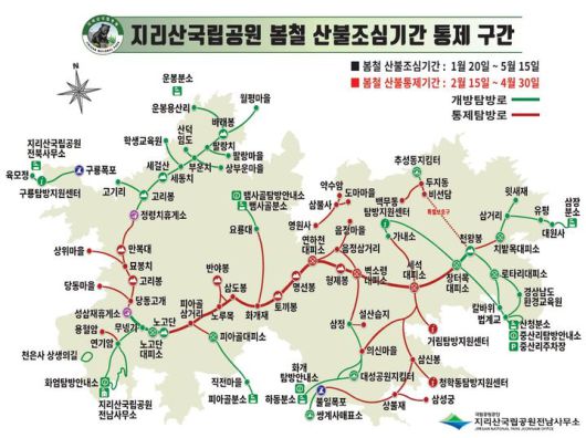 전남사무소 박종섭 재난안전과장은 "지리산 산불 예방을 위해 사전 탐방로 통제 현황을 확인해 개방된 정규 탐방로를 이용하고, 산불 발견 시 국립공원사무소나 가까운 소방서 등에 즉시 신고 바란다"고 말했다.