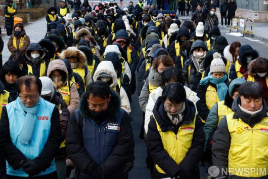 [서울=뉴스핌] 류기찬 기자 = 민주노총 서비스연맹이 21일 오전 서울 종로구 MBK 파트너스 사무실 앞에서 열린 ‘MBK규탄 마트노조 홈플러스지부 간부 결의대회’에서 묵념을 하고 있다. 2026.01.21 ryuchan0925@newspim.com