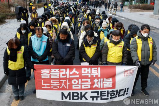 [서울=뉴스핌] 류기찬 기자 = 민주노총 서비스연맹이 21일 오전 서울 종로구 MBK 파트너스 사무실 앞에서 열린 ‘MBK규탄 마트노조 홈플러스지부 간부 결의대회’에서 묵념을 하고 있다. 2026.01.21 ryuchan0925@newspim.com