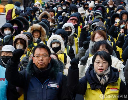 [서울=뉴스핌] 류기찬 기자 = 민주노총 서비스연맹이 21일 오전 서울 종로구 MBK 파트너스 사무실 앞에서 ‘MBK규탄 마트노조 홈플러스지부 간부 결의대회’를 열고 구호를 외치고 있다. 2026.01.21 ryuchan0925@newspim.com