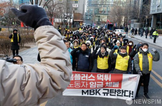 [서울=뉴스핌] 류기찬 기자 = 민주노총 서비스연맹이 21일 오전 서울 종로구 MBK 파트너스 사무실 앞에서 ‘MBK규탄 마트노조 홈플러스지부 간부 결의대회’를 열고 구호를 외치고 있다. 2026.01.21 ryuchan0925@newspim.com