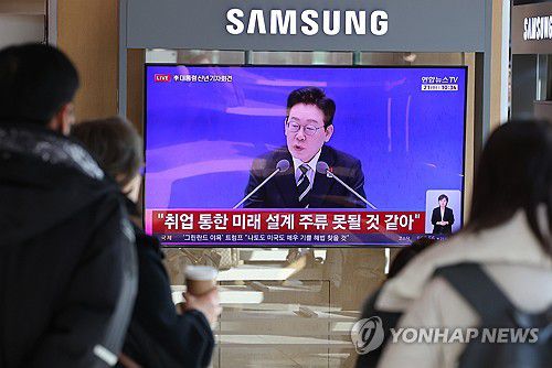 (서울=연합뉴스) 서명곤 기자 = 21일 서울 용산구 서울역 대합실에서 시민들이 이재명 대통령 신년 기자회견 방송을 지켜보고 있다. 2026.1.21