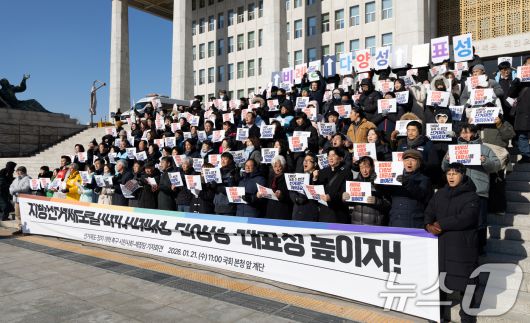 (서울=뉴스1) 이승배 기자 = 21일 서울 여의도 국회 본청 앞 계단에서 열린 선거제도·정당 개혁촉구 시민사회-제정당 기자회견에서 참가자들이 선거제도 개혁을 촉구하고 있다. 2026.1.21/뉴스1