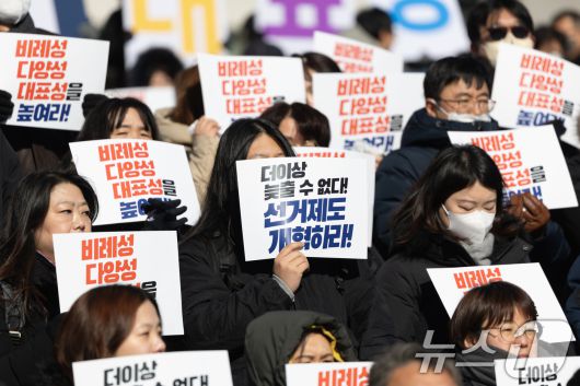 (서울=뉴스1) 이승배 기자 = 21일 서울 여의도 국회 본청 앞 계단에서 열린 선거제도·정당 개혁촉구 시민사회-제정당 기자회견에서 참가자들이 선거제도 개혁을 촉구하고 있다. 2026.1.21/뉴스1