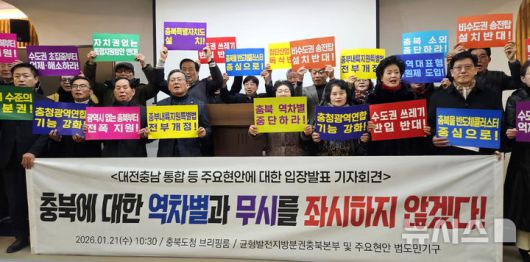 [청주=뉴시스] 연현철 기자 = 균형발전지방분권충북본부 등 충북지역 8개 시민사회단체가 21일 충북도청 브리핑룸에서 대전·충남 행정통합을 비롯한 수도권 반도체 클러스터 조성 및 비수도권 송전탑 설치, 수도권 쓰레기 충북 반입 소각 등에 대해 반대하는 입장의 기자회견을 하고 있다. 2026.01.21. yeon0829@newsis.com |