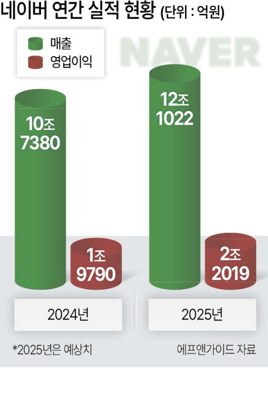 21일 금융정보업체 에프앤가이드에 따르면, 네이버의 지난해 연간 매출은 12조1022억원, 영업이익은 2조2019억원으로 추정된다. 이는 각각 전년 대비 12.7%, 11.3% 증가한 수치다.