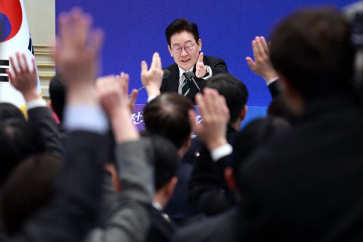 이재명 대통령이 21일 청와대 영빈관에서 열린 2026년 신년 기자회견에서 질문을 받고 있다. |