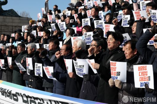 [서울=뉴스핌] 정일구 기자 = 21일 오전 서울 여의도 국회 본청 앞 계단에서 열린 선거제도·정치개혁 촉구 시민사회-제정당 기자회견에서 참가자들이 구호를 외치고 있다. 2026.01.21 mironj19@newspim.com