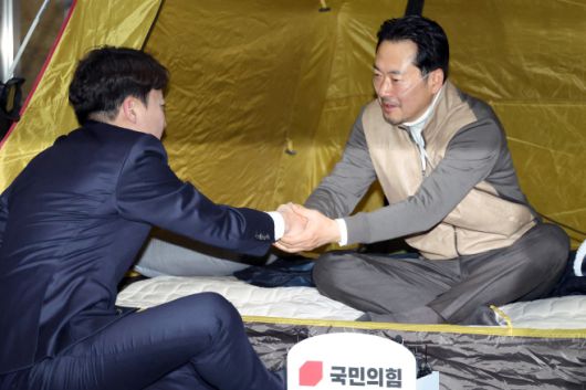 장동혁 국민의힘 대표가 21일 국회 로텐더홀에 마련된 단식 농성장에서 이준석 개혁신당 대표를 만나고 있다. /송의주 기자 |
