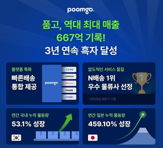 풀필먼트 서비스 품고(Poomgo)를 운영하는 두핸즈(대표 박찬재)는 2025년 연매출 667억 원을 기록하며 역대 최대 실적을 달성했다고 21일 밝혔다. 이는 전년 매출 433억 원 대비 51% 증가한 수치로, 2023년 이후 3년 연속 흑자 기조를 유지하고 있다.