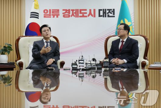 (대전=뉴스1) = 이장우 대전시장과 김태흠 충남도지사가 21일 대전시청 접견실에서 대전·충남 행정통합 관련 긴급 회동을 갖고 있다. (공동취재)2026.1.21/뉴스1presskt@news1.krCopyright ⓒ 뉴스1. All rights reserved. 무단 전재 및 재배포, AI학습 이용 금지.