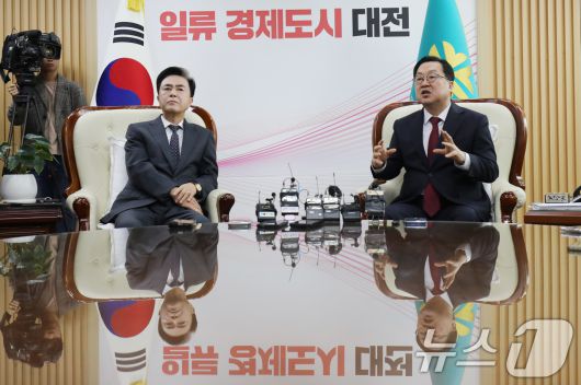 (대전=뉴스1) = 이장우 대전시장과 김태흠 충남도지사가 21일 대전시청 접견실에서 대전·충남 행정통합 관련 긴급 회동을 갖고 있다. (공동취재)2026.1.21/뉴스1