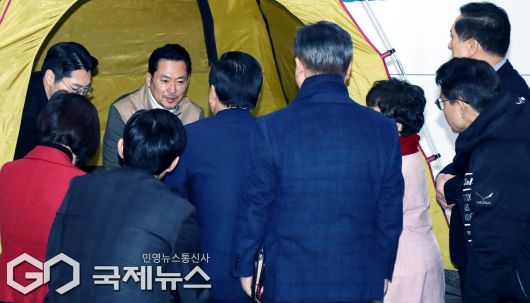 (서울=국제뉴스) 통일교·공천헌금 '쌍특검'을 요구하며 이레째 단식농성중인 장동혁 국민의힘 대표가 21일 오전 서울 여의도 국회 로텐더홀 농성장 텐트에서 이영훈 여의도순복음교회 담임목사 등 방문객들과 대화하고 있다./사진=이용우 기자