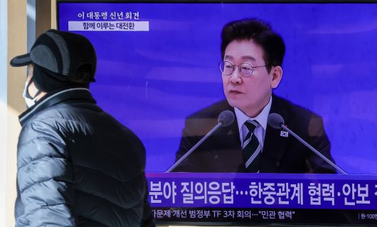 21일 오전 서울역 대합실에서 이재명 대통령 신년회견이 방송되고 있다./박성원 기자 |
