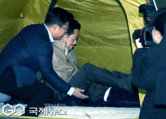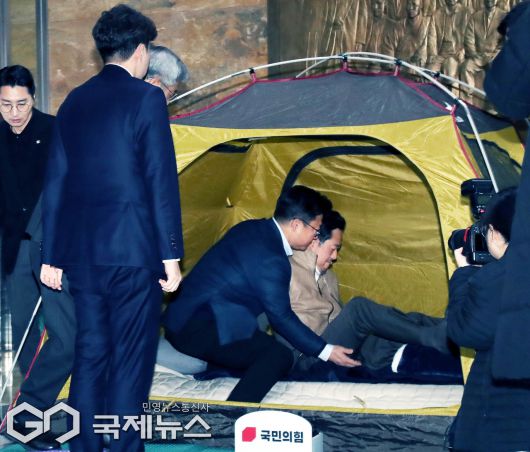 (서울=국제뉴스) 통일교·공천헌금 '쌍특검'을 요구하며 이레째 단식농성중인 장동혁 국민의힘 대표가 21일 오전 서울 여의도 국회 로텐더홀 농성장 텐트에서 박준태 비서실장의 부축을 받으며 눕고있다./사진=이용우 기자