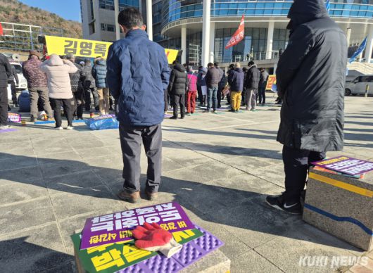 전국농민회총연맹 광주전남연맹, 전국여성농민회총연합 광주전남연합, (사)전국쌀생산자협회 광주전남본부 등 3개 단체 회원 200여 명은 2025년 12월 9일 오전 전남도청 앞에서 ‘벼 경영안정대책비 삭감 김영록 도지사 퇴진 광주전남농민대회’를 열고 벼 경영안정대책비의 즉각적인 원상회복을 요구했다. /신영삼 기자 |