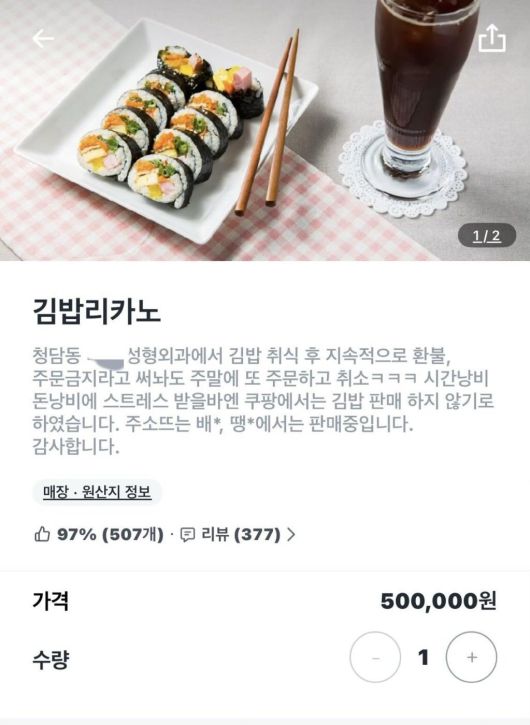 메뉴 설명란에는 “청담동 ○○성형외과에서 김밥을 취식한 뒤 지속적으로 환불과 취소를 반복했다“며 ”주문 금지를 안내했음에도 주말마다 주문이 이어져 시간과 비용, 정신적 부담이 컸다. 이에 해당 플랫폼에서는 김밥을 판매하지 않기로 했다”고 안내했다.