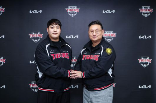 KIA타이거즈 조상우가 FA 계약을 맺은 뒤 심재학 단장과 함께 기념촬영을 하고 있다. 사진=KIA타이거즈 |