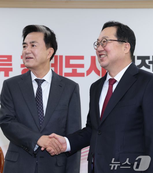 (대전=뉴스1) 김기태 기자 = 이장우 대전시장과 김태흠 충남도지사가 21일 대전시청 접견실에서 대전·충남 행정통합 관련 긴급 회동에서 악수하고 있다. 2026.1.21/뉴스1