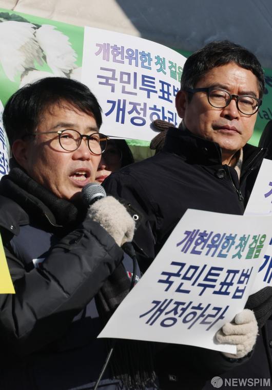 [서울=뉴스핌] 이형석 기자 = 시민주도 헌법개정 전국 네트워크가 21일 오전 서울 여의도 국회 앞에서 ‘11년째 직무유기, 국민투표법 개정 않는 국회 규탄한다!’ 신년기자회견을 열고 있다. 2026.01.21 leehs@newspim.com