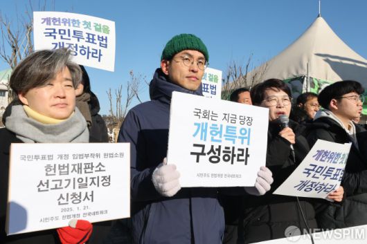 [서울=뉴스핌] 이형석 기자 = 전종덕 진보당 의원이 21일 오전 서울 여의도 국회 앞에서 열린 ‘11년째 직무유기, 국민투표법 개정 않는 국회 규탄한다!’ 시민개헌넷 신년기자회견에서 발언을 하고 있다. 2026.01.21 leehs@newspim.com