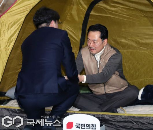 (서울=국제뉴스) 장동혁 국민의힘 대표가 21일 오전 서울 여의도 국회 로텐더홀에서 '민주당의 공천 뇌물·통일교 게이트 특검 수용'을 촉구하며 단식농성 중 이준석 개혁신당 대표와 악수를 하고 있다./사진=이용우 기자