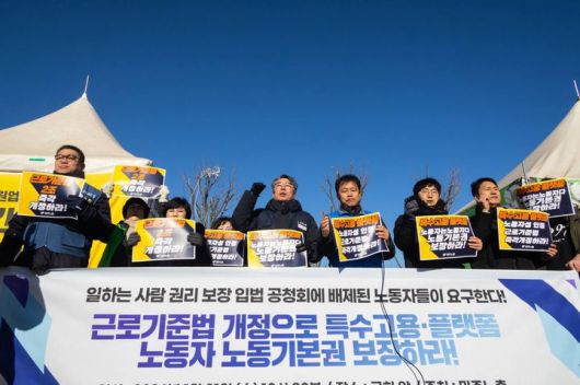 이들은 "그동안 특고·플랫폼 노동자 권리 보장을 위해 근로기준법 2조 정의 규정을 개정해 근로자성을 인정하라고 요구해왔다"며 "일하는 사람 기본법과 함께 근로자 추정제 도입을 추진하겠다고 하지만, 노동자 권리 보장의 기본이 되고 기준이 되는 근로기준법 적용 노동자를 확대 강화하는 방향은 여전히 부재하다"고 비판했다.
