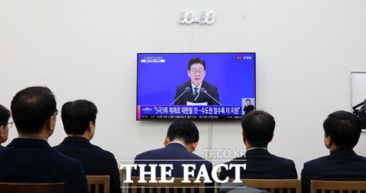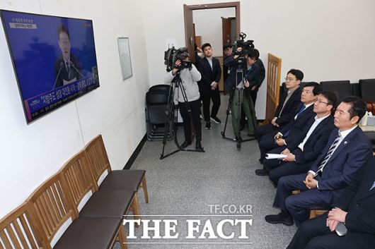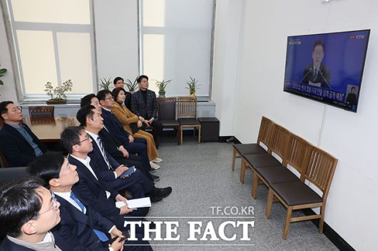 [더팩트ㅣ국회=남용희 기자] 정청래 더불어민주당 대표와 한병도 원내대표를 비롯한 지도부가 21일 오전 서울 여의도 국회 당대표실에서 이재명 대통령의 신년 기자회견 생중계를 시청하고 있다.