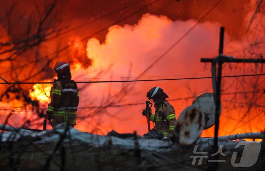 16일 오전 서울 강남구 개포동 구룡마을에서 불이나 출동한 소방대원들이 진화작업을 벌이고 있다. 2026.1.16/뉴스1 ⓒ News1 김진환 기자 |