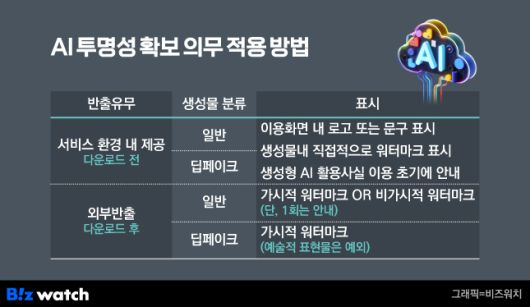 반면 생성물을 다운로드해 AI 서비스 외부로 반출할 경우 기준이 달라진다. 실제와 혼동될 수 있는 딥페이크 생성물인지, 애니메이션·웹툰 등 가상성이 명확한 일반 생성물인지에 따라 표시 방식이 구분된다.