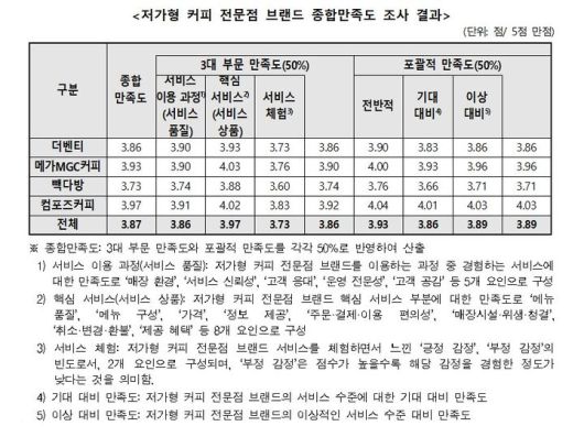 이어 메가MGC커피(3.93점), 더벤티(3.86점), 빽다방(3.73점) 순으로 집계됐다.