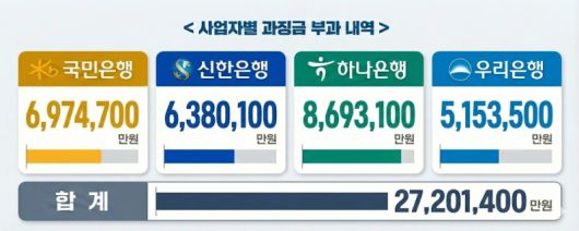 은행별 과징금 규모는 하나은행이 869억3100만원으로 가장 많았다. 이어 △KB국민은행 697억4700만원 △신한은행 638억100만원 △우리은행 515억3500만원 순이다.