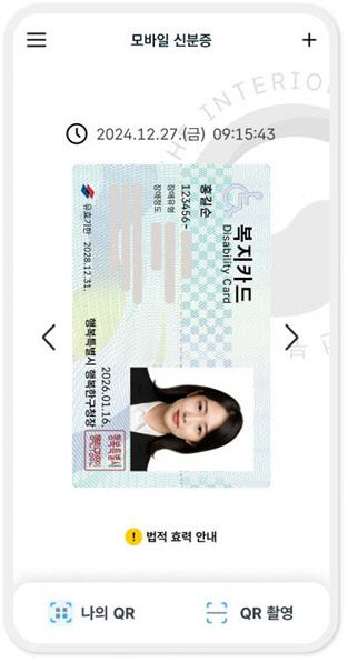 발급 방식은 두 가지다. 지자체 담당자가 출력하는 QR코드(격자무늬 2차원)를 촬영, 신청 당일에 발급받거나 집적회로(IC) 칩이 내장된 장애인등록증을 새로 신청하고 IC등록증을 스마트폰에 접촉해 받을 수 있다.