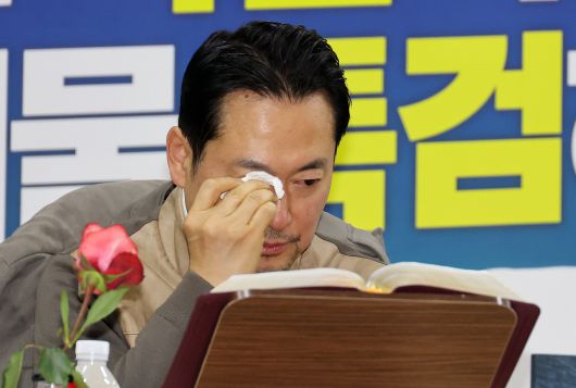 당원들의 응원을 받으며 눈시울을 붉힌 국민의힘 장동혁 대표가 21일 서울 여의도 국회 로텐더홀 단식 농성장에서 눈물을 닦고 있다. 통일교·공천헌금 관련 '쌍특검' 수용을 요구하며 단식에 들어간 장 대표는 이날로 단식 7일 차를 맞았다. /연합뉴스 |