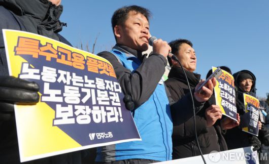 [서울=뉴스핌] 이형석 기자 = 전국민주노동조합총연맹이 21일 오전 서울 여의도 국회 앞에서 ‘근로기준법 개정으로 특수고용·플랫폼 노동자 노동기본권 보장하라!’ 기자회견을 열고 있다. 2026.01.21 leehs@newspim.com